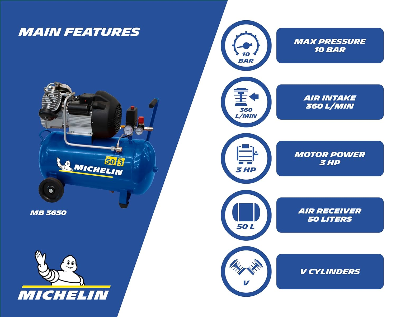 Draagbare Luchtcompressor MICHELIN MB3650 – 50 L Ketel – 3 PK Motor – 10 Bar – 360 L/min